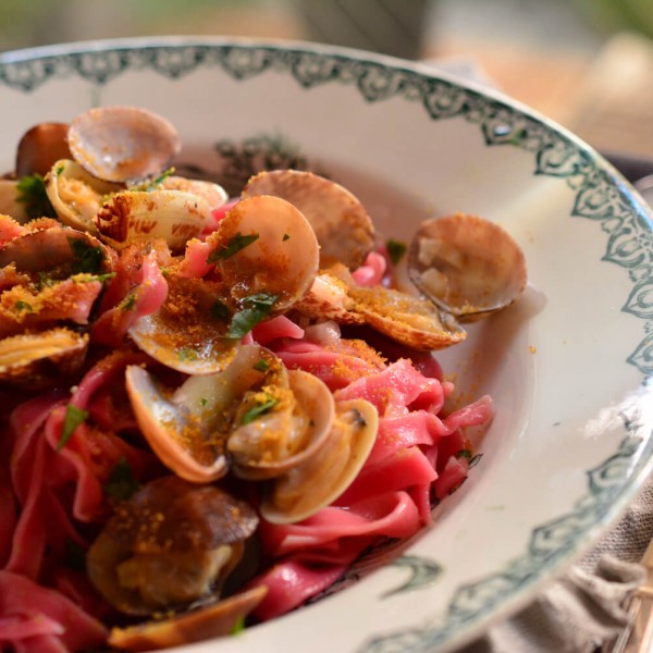 ビーツ練り込みタリアテッレ ボンゴレビアンコ