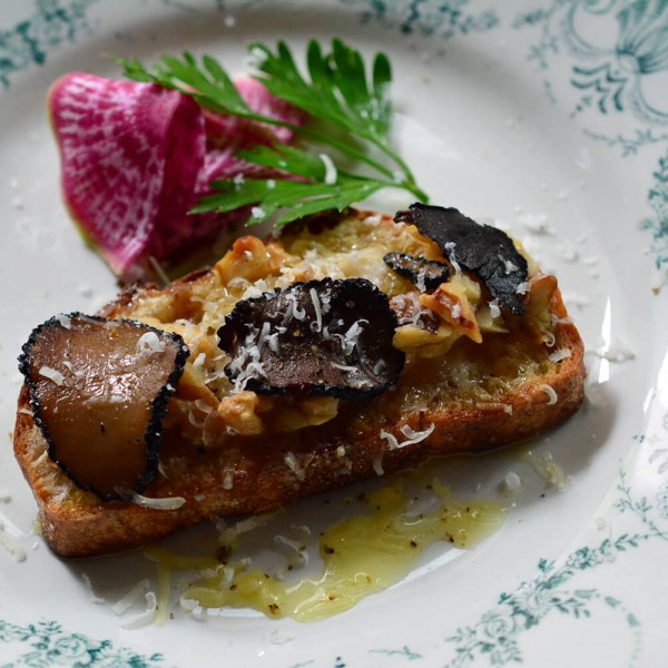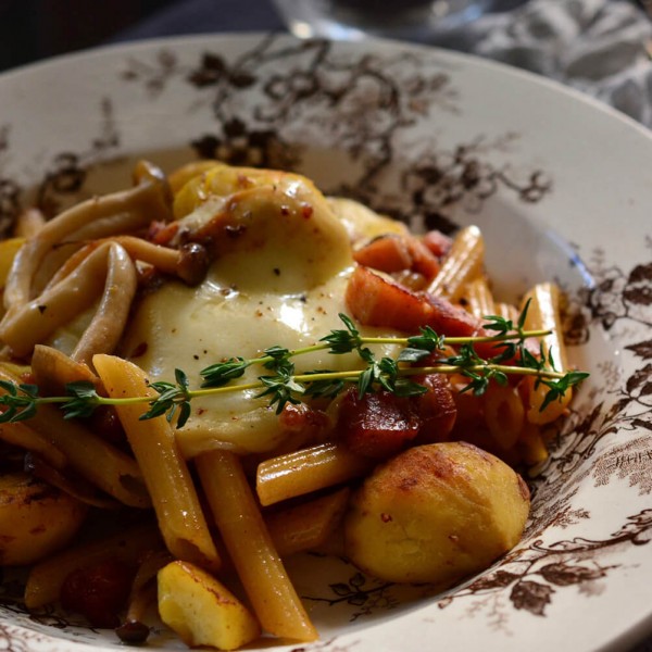 栗とベーコン、しめじのペンネ スカモルツァ・アッフミカータ乗せ
