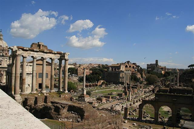 フォロ・ロマーノがローマ市の中心となったのはいつか、というとそれは未だにはっきりとはしていないようです。ロムルスとレムス兄弟によってローマ建設が成ったのは紀元前753年頃。一説によると、フォロ・ロマーノの整備はその後、紀元前6世紀頃に始まったとされています。沼地のような湿地帯で、墓地として使われていたような場所が、それぞれの丘にある村落にとって中心に位置し、中立な原野であったために、会合や会談の場として選ばれたのだと言われています。そこから次第に干拓や水道整備が進み、やがて市場としての利用も始まり、神殿や会堂などの公共建築が建てられ、元老院の会議が執り行われ、会堂の一角では商店や私塾などもできるなど、まさに中心地としてローマの発展とともに繁栄していきました。