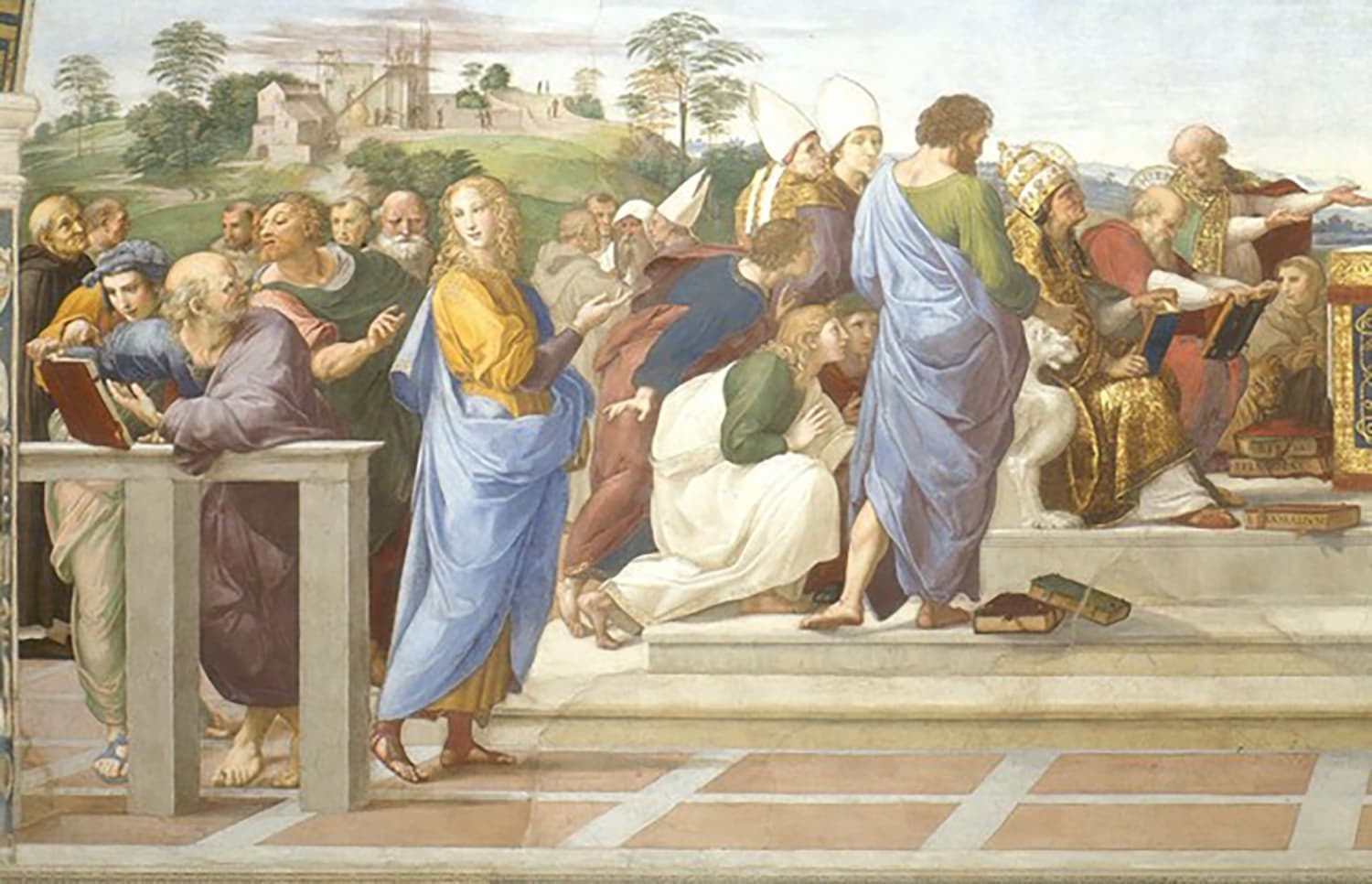 この作品が制作されたのは1509〜1510年ごろ。署名の間は、教皇が重要な文書に署名したり、決定を下したりする厳かな空間でした。絵は上下二層に分かれ、上は天上界、下は地上界を表しています。上段には中央にキリスト、その両脇に聖母マリアと洗礼者ヨハネ、さらにペテロやパウロといった使徒たちが並びます。そのさらに上方には、天の父なる神と、聖霊を象徴する鳩が描かれています。下の地上界では、祭壇の上に輝く聖体を中心に、教父や神学者、聖人たちが集まり、「聖体の意味」をめぐって議論を交わしている様子が描かれています。