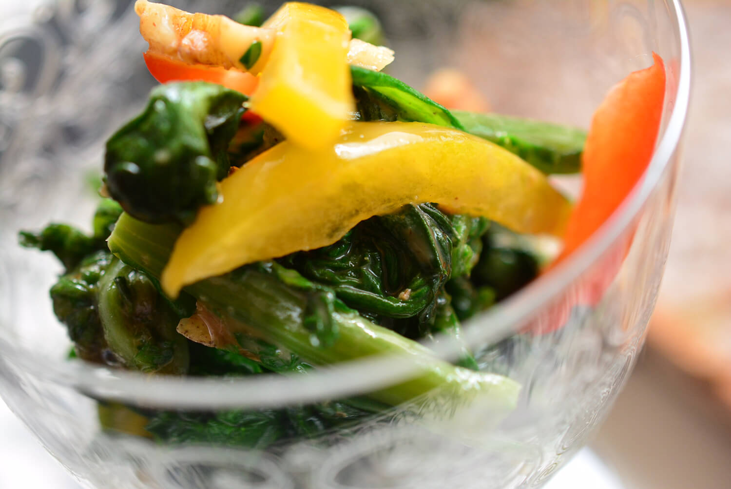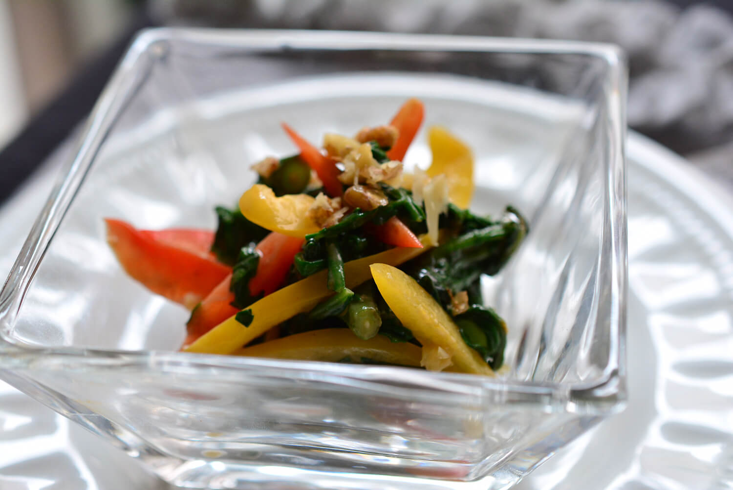 春菊とパプリカのヘーゼルナッツ和え How to cook 胡麻和えと同じ要領でヘーゼルナッツペーストを使用しました。ナッツの風味がワインにも相性がよく、前菜として美味しくいただけます。 ・春菊 1袋 ・パプリカ(赤・黄) 各少量 ・ヘーゼルナッツペースト 大1 ・砂糖 小1 ・醤油 小2 ・くるみ 適量 ボウルにヘーゼルナッツペーストと砂糖、醤油を入れてよく混ぜる。 春菊を茎から塩茹でにして、ザルにあける。水気を絞り、3cm幅にカットして1に入れる。 パプリカを薄切りにし、1に加えてよく混ぜる。 器に盛り、みじん切りにしたくるみを乗せる。 レシピ、写真/宇梶 由里子 1975年生まれ。大学卒業後、フランス家庭料理を学び、その後、旅行好きが高じてイタリア料理やタイ料理など様々な国の料理を身に付ける。フードアナリスト協会会員。2015年7月より母と共に自宅でイタリアン、フレンチの料理教室を開催している(現在会員制)。 Recommended Products Nocciole d’Elite ヘーゼルナッツ ピュア ペースト 200g Post Share Hatena Pocket RSS feedly Pin it RECIPE ジャム・スプレッド, ヘーゼルナッツ, ヘーゼルナッツペースト スナップエンドウのヘーゼルナッツソースかけ 冷製マッシュルームスープ パプリカ乗せ