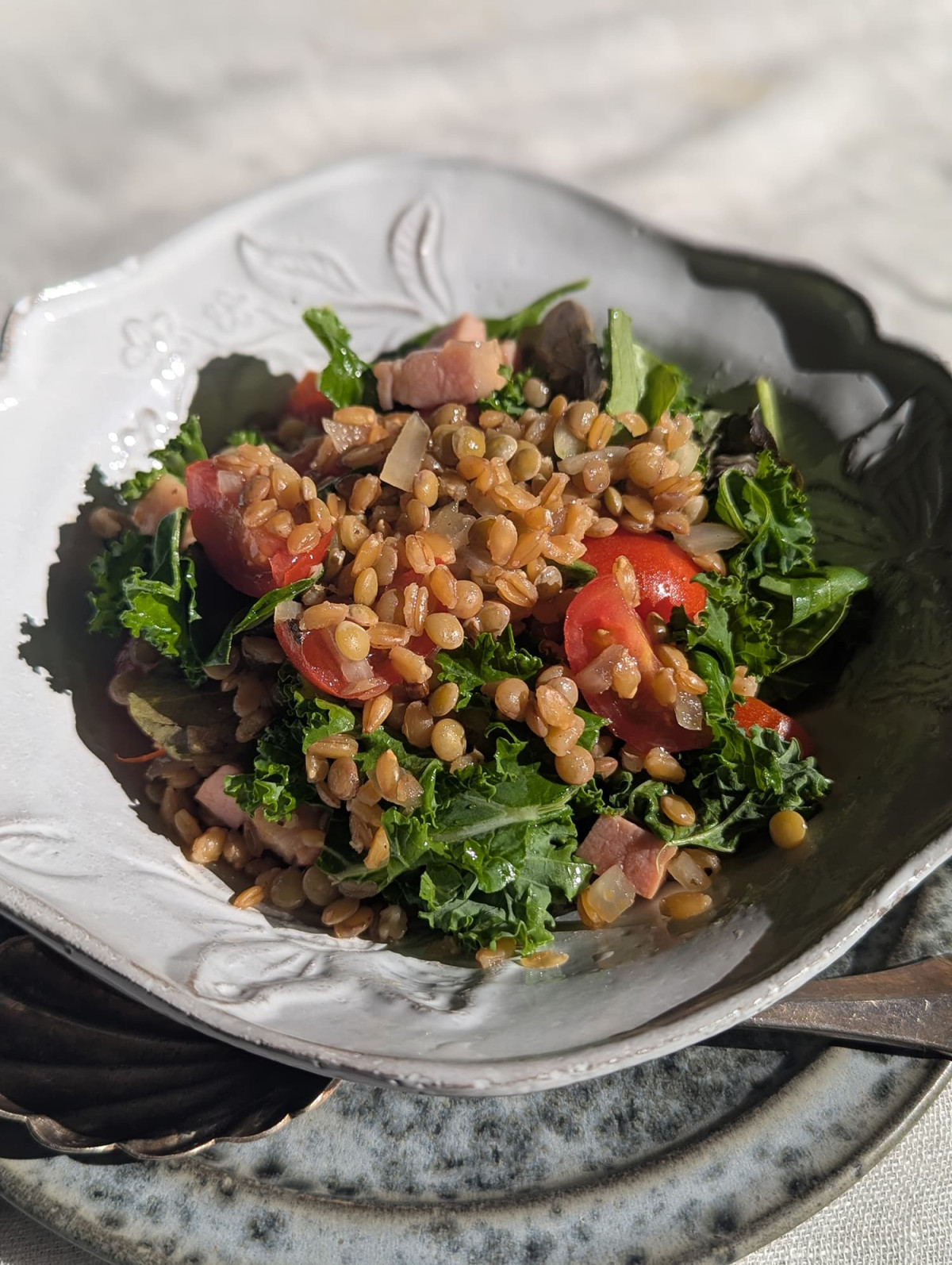 3. 茹で上がった古代米とレンズ豆はお湯を機ttえボウルに入れ、2のベーコンと玉ねぎと加え、塩。バルサミコビネガー、オリーブオイル、こしょうを加えてよく混ぜ、味が染みるまで30分程度冷蔵庫で冷やす。