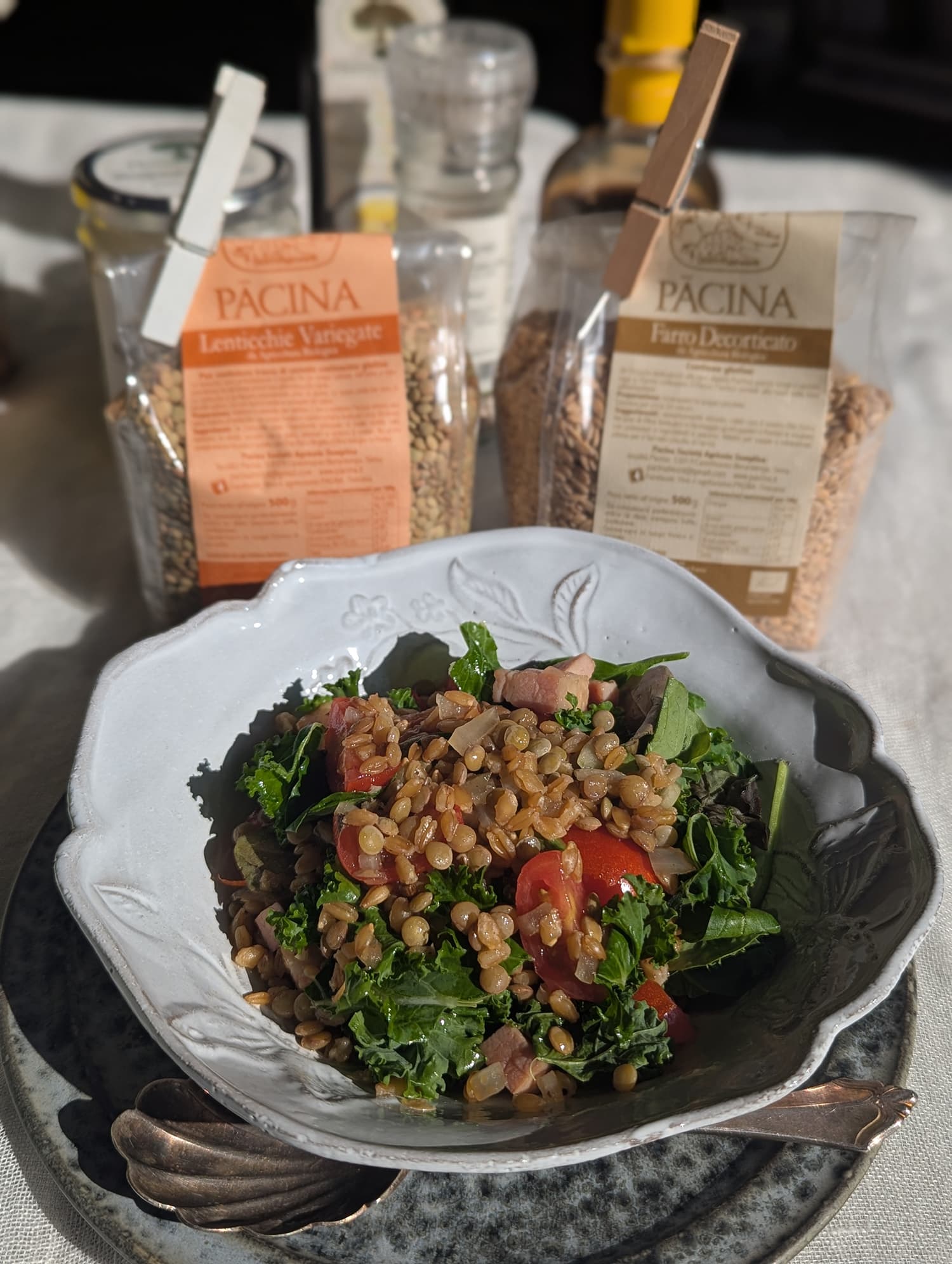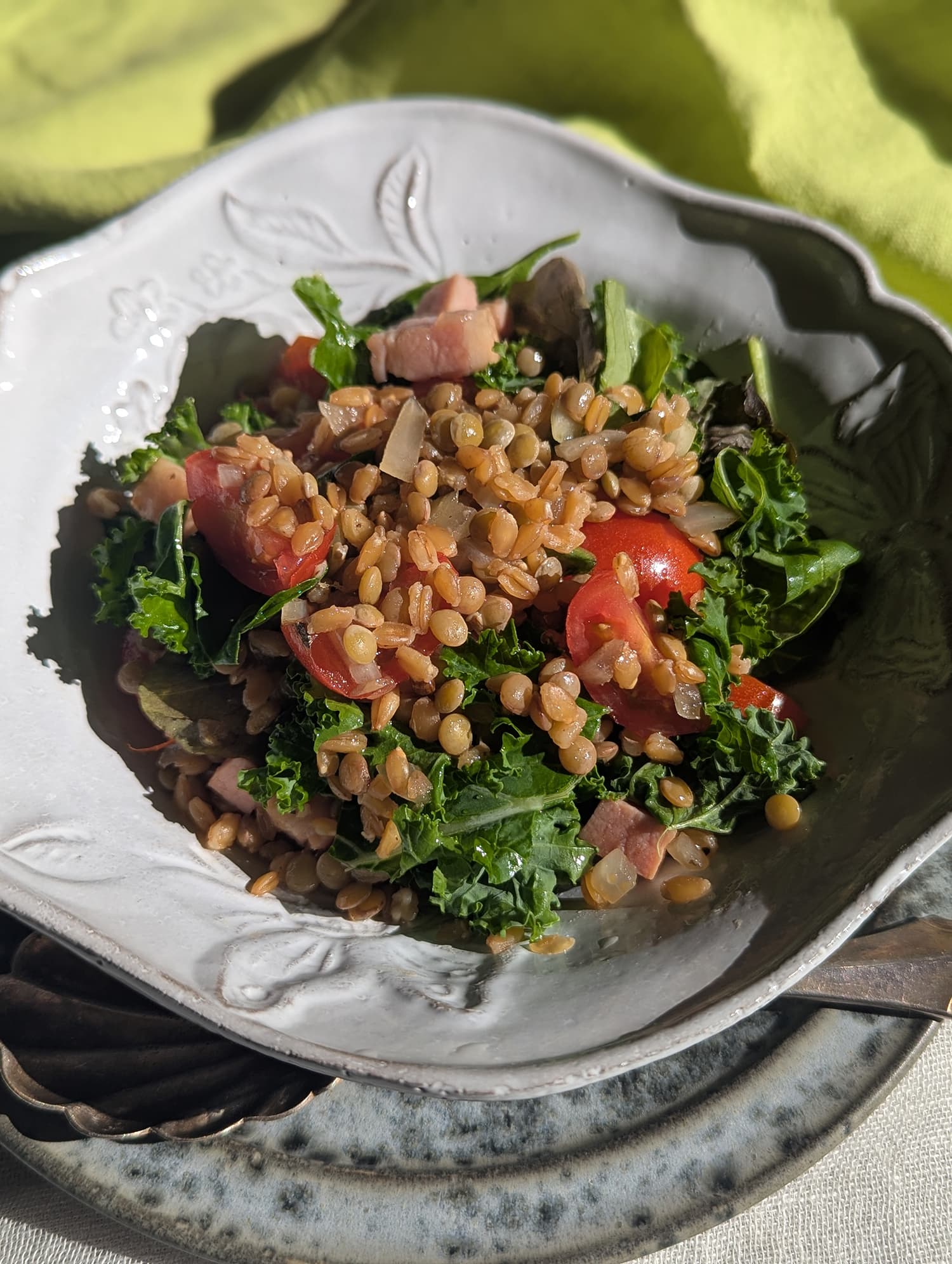 一緒に茹でた古代米とレンズ豆のぷちぷちした食感と風味が楽しいサラダ。