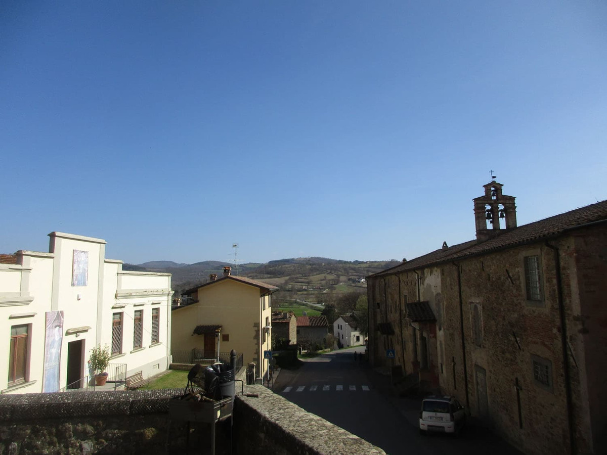 前回のメルマガでご紹介した、ピエロ・デッラ・フランチェスカの故郷サンセポルクロからローカルバスで約20分、モンテルキという小さな小さな村があります。バス停のある県道から、最後はゆるやかな坂を上って10分くらい。途中に村の名前と共に「ピエロ・デッラ・フランチェスカ 出産の聖母」と書かれた標識があるほど、この作品があることで知られている村です。ここはギリシャ神話に出てくるエルコレによって建設された、という伝説が残っていることから、モンテ・エルコレ(=エルコレ山)、そして現在はモンテルキという名前になったと言われています。村を囲む城塞は中世時代のもので、1917年にあった大地震にも持ちこたえて村が残ったそうです。