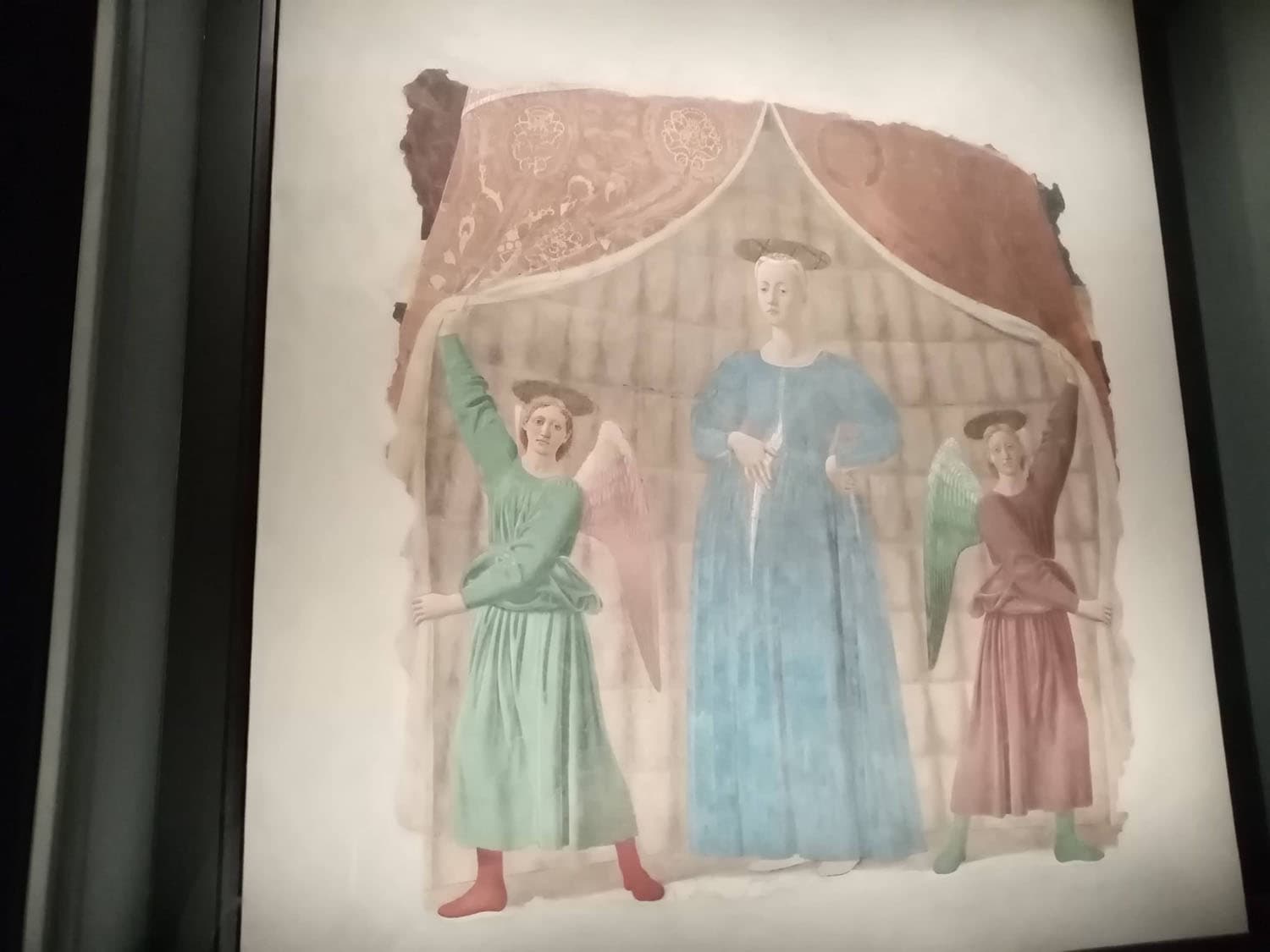 「出産の聖母」は、1450~65年頃の作品とされていますが、1459年に母の故郷であるこの地をピエロが訪れた際に描かれたのでは?と推測されています。このフレスコ画は旧市街外のサンタ・マリア・ディ・モメンターナ礼拝堂に描かれたものですが、1785年、そこに市の墓地を建設するに際して移動され、1911年まではその存在が知られていなかったという逸話が残っています。その後、いったんサンセポルクロに移動したりしながらも、現在は元々作品のあったモンテルキの、現在の場所に置かれることになりました。 私が最後に訪れた時も作品解説のビデオルーム、作品の部屋、ワークショップなどが行われる部屋、ブックショップがありますが、近郊の村・アンギアーリの老舗生地メーカー・ブサッティがスポンサーとなり展示ルート整備のための内部改装プロジェクトが進んでいるそうです。