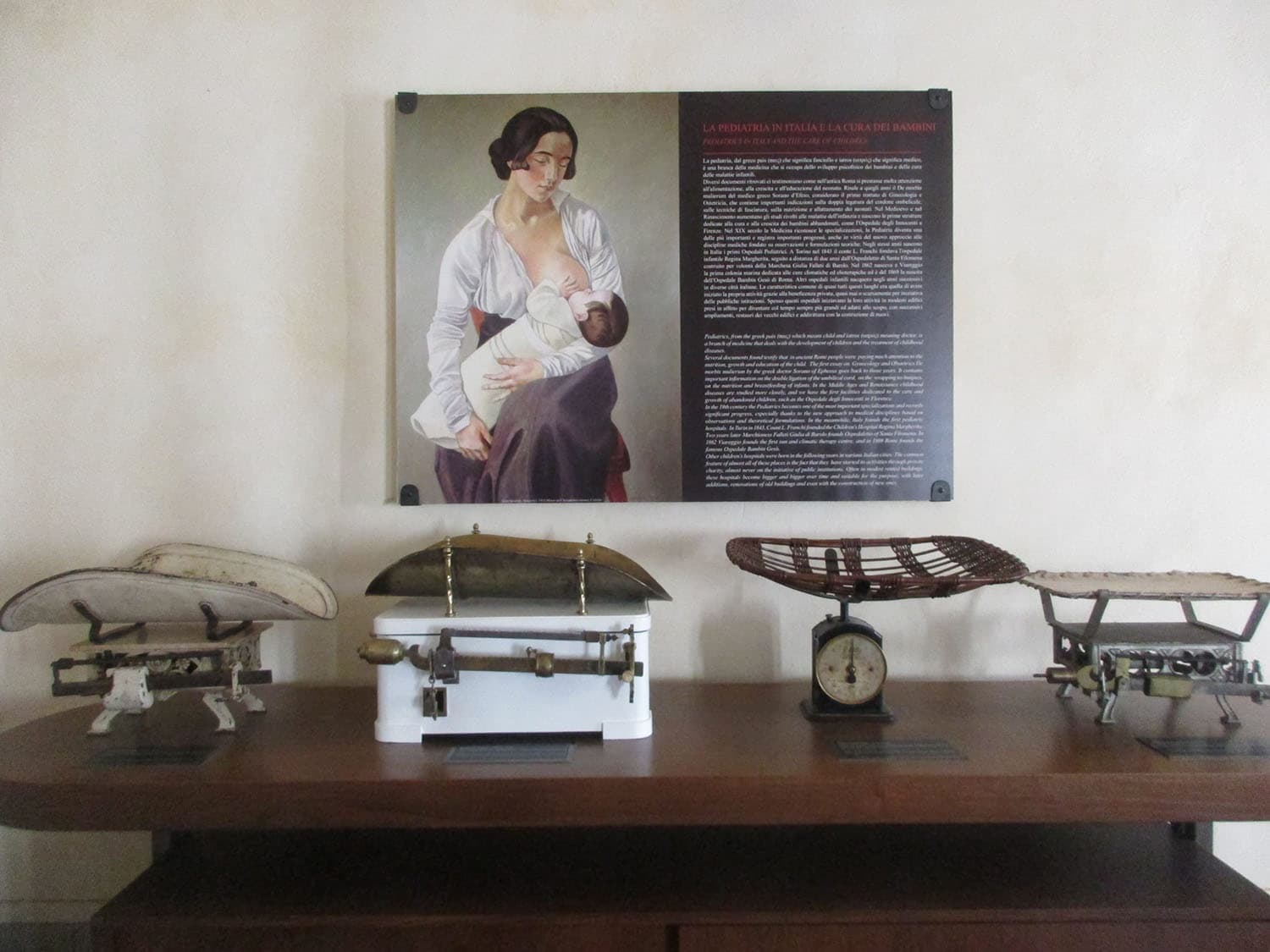 ヨーロッパでも指折りのこの量りの博物館は、量りの収集家であるヴェリオ・オルトラーニのコレクションで、アンティーク市や古物商で買い集めた量りは100以上、一番古いものは、なんと1400年代のものだそうです。最初の間は、人間の量り。歴代の赤ちゃん用の体重計と、大人が立って量る体重計は自分で鏡で見るようになってます。左から2番目の体重計は、私が次男の時に保健所から借りたものと同型で、これを見た時、イタリアの古いものを大切に使う文化を実感しました。それから薬草の量りや郵便局の小包用量り、毛糸の量り、イタリアらしいワインの樽の量りも。他にも小さな小さな懐中量りに、組み立て式で箱に入った量り、そしてこれまたイタリアらしい、パルミッジャーノ・レッジャーノ用の量りまで。 こんな量りが!というだけでも興味深いですが、その鋳造の細かさに芸術を感じたり、レトロなロゴや錆に萌えてしまったり、いろんなツボにハマる面白い博物館です。