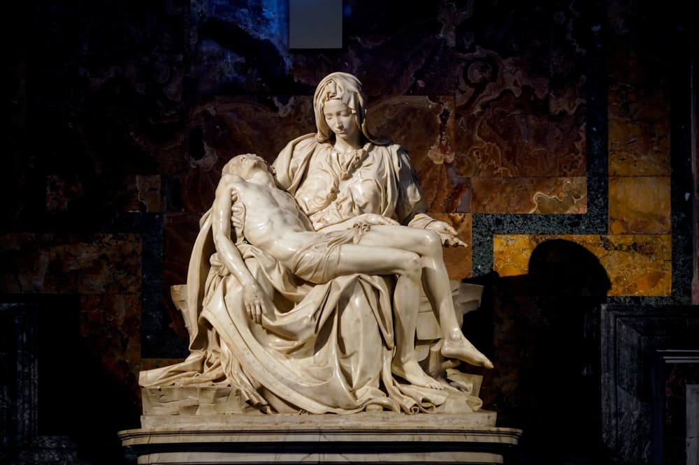 サン・ピエトロ大聖堂内で、ひと際人々が集まる場所があります。ミケランジェロの《ピエタ》の前です。白い大理石で彫られたこの彫刻は、巨大な聖堂のスケールとは対照的に、驚くほど内向きで、親密な空気をまとっています。