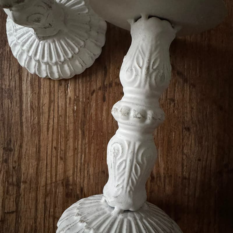 他の画像を見る シャビーシック ブラック オーナメントスタンド(2点セット) 販売価格 ¥ 3,300 税込 落ち着いたマットブラックの質感が印象的な、クラシカルデザインのオーナメントスタンド。脚部には植物を思わせる繊細なレリーフが施され、どの角度から見ても美しいフォルムです。ペアで飾ることで、まるでヨーロッパの古い邸宅にあるディスプレイのような雰囲気に。キャンドルホルダーとしてはもちろん、アクセサリーやドライフラワー、オブジェを載せても絵になります。マットな質感が光を柔らかく受け、飾るものを上品に引き立ててくれます。(返品不可) お気に入りに登録する